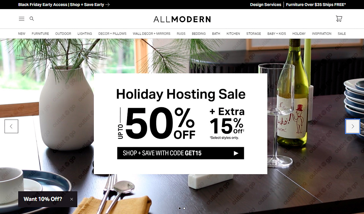 OutletGO — простой сервис для покупки и доставки товаров с официального сайта AllModern из США в Россию. В магазине AllModern современные интерьеры и декоративные предметы сочетаются с удивительным дизайном. От мебели до осветительных приборов, каждый элемент коллекции отражает последние тренды в мире дизайна интерьеров. Если вы ищете свежие и стильные решения для своего дома, AllModern предоставляет множество вариантов для выбора. Покупайте всё, что хочется прямо из дома, экономьте до 60% на распродажах и акциях.