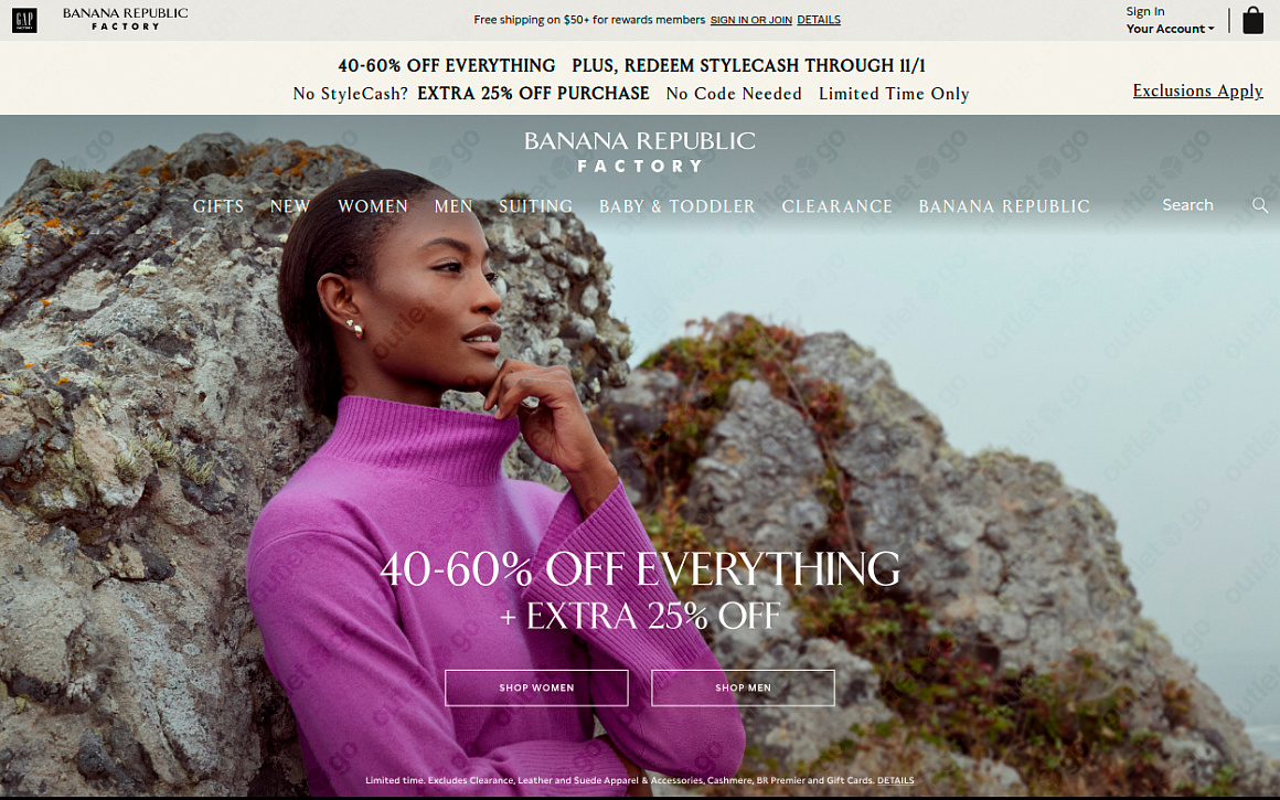 OutletGO — простой сервис для покупки и доставки товаров с официального сайта Banana Republic Factory из США в Россию. В этом магазине покупатели найдут элегантную и функциональную одежду. Banana Republic Factory делает акцент на современной одежде с классическими нотками. Покупайте всё, что хочется прямо из дома, экономьте до 60% на распродажах и акциях.