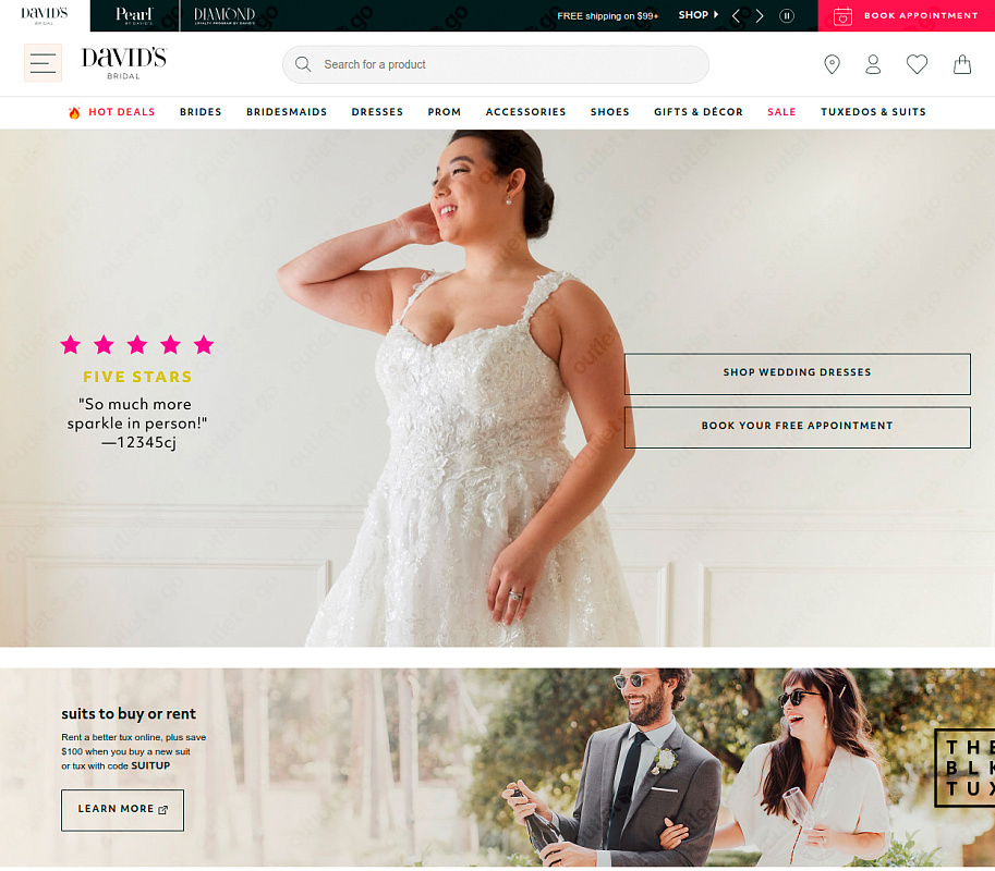 OutletGO — простой сервис для покупки и доставки товаров с официального сайта David's Bridal из США в Россию. В магазине David's Bridal представлены свадебные платья и аксессуары для самых важных моментов вашей жизни. Благодаря множеству стилей и дизайнов, каждая невеста найдет идеальное платье для своего специального дня. Не имеет значения, ищете ли вы классику или современные тенденции, здесь есть что-то для каждой мечтающей о волшебной свадьбе. Покупайте всё, что хочется прямо из дома, экономьте до 60% на распродажах и акциях.