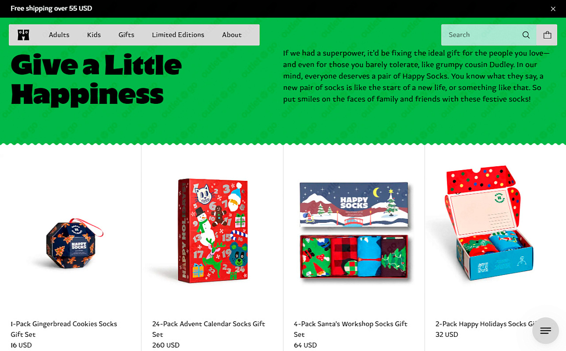 OutletGO — простой сервис для покупки и доставки товаров с официального сайта Happy Socks из США в Россию. В магазине Happy Socks вы найдете яркие и веселые носки для всей семьи. С множеством дизайнов и расцветок, каждый найдет пару носков, которая поднимет настроение. Покупайте всё, что хочется прямо из дома, экономьте до 60% на распродажах и акциях.