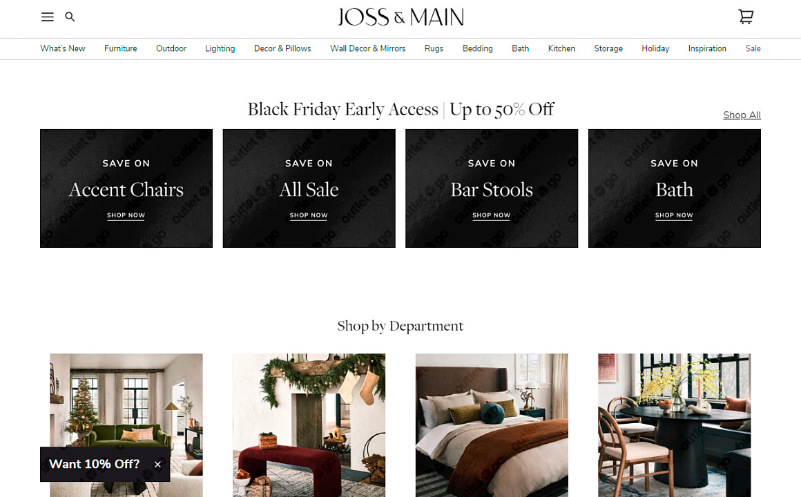 OutletGO — простой сервис для покупки и доставки товаров с официального сайта Joss & Main из США в Россию. В Joss & Main покупатели найдут стильную мебель и декор для каждого помещения. От спальни до гостиной, каждый уголок дома может быть трансформирован. Желаете добавить элегантности вашему интерьеру? Joss & Main предлагает множество стильных решений. Покупайте всё, что хочется прямо из дома, экономьте до 60% на распродажах и акциях.