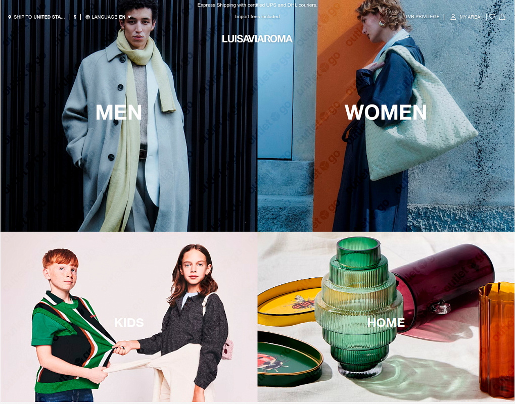 OutletGO — простой сервис для покупки и доставки товаров с официального сайта LUISAVIAROMA из США в Россию. Luisaviaroma — это место, где модные тенденции и высокое качество сливаются воедино. Любители моды найдут здесь последние новинки от ведущих дизайнеров мира. Покупайте всё, что хочется прямо из дома, экономьте до 60% на распродажах и акциях.