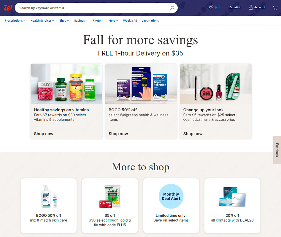 OutletGO — простой сервис для покупки и доставки товаров с официального сайта Walgreens из США в Россию. В Walgreens представлены товары для здоровья и красоты. От лекарств до косметики, здесь есть все для вашего благополучия. Нужны витамины или средства для ухода? Walgreens всегда на страже вашего здоровья. Покупайте всё, что хочется прямо из дома, экономьте до 60% на распродажах и акциях.